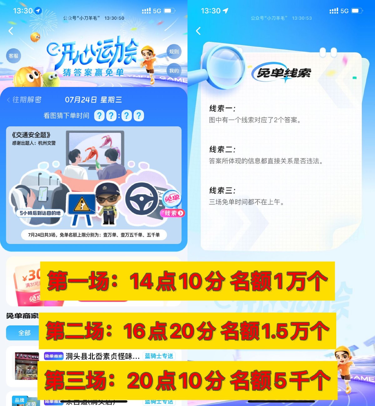饿了么搜索“免单”,根据提示猜时间下单,每场最多免39亓,每人最多可免1次